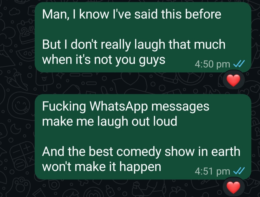 I have often sent messages to my friends about how it is only when I’m surrounded by them that I am truly able to laugh. Maybe it has got to do with the sense of security I feel around them. That I can be unabashed, and I don’t have to hide behind anything. Perhaps, I feel a lot more free-er. When college got over, and I was working remotely, this would happen so little. I could hear the silence around me. I don’t think I could hear myself laugh that much.